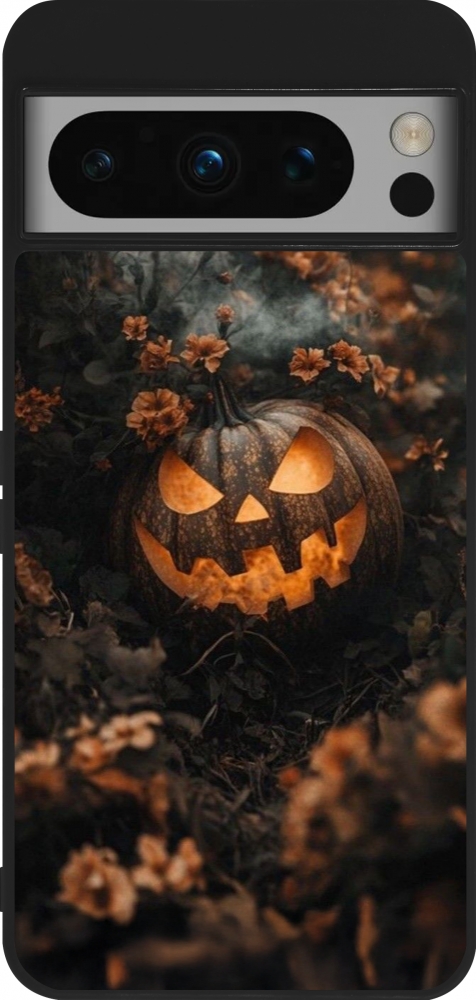 Coque Google Pixel 8 Pro - Silicone rigide noir Halloween 2025 Pumpkin with flowers