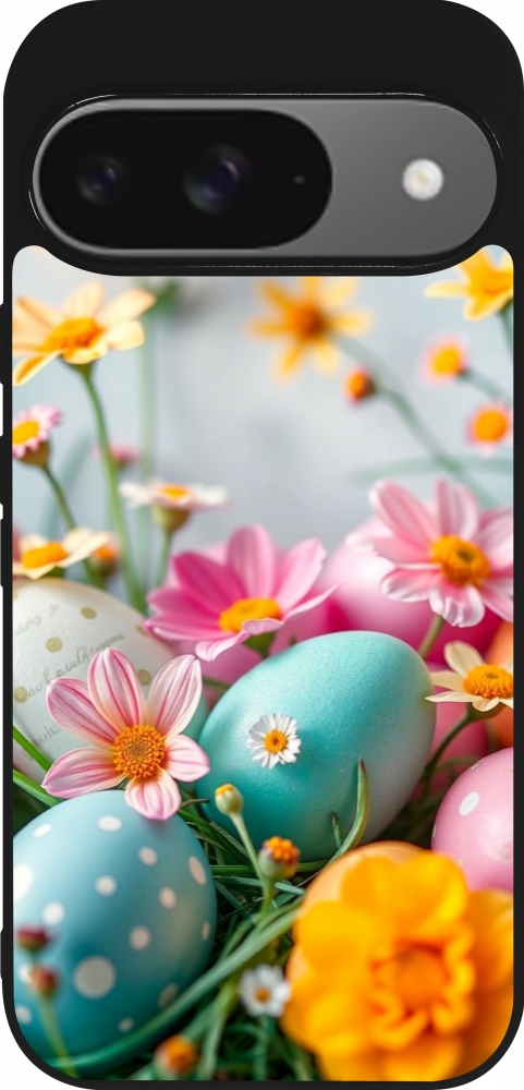 Coque Google Pixel 9 / Pixel 9 Pro - Silicone rigide noir Easter 2026 Eggs with flowers