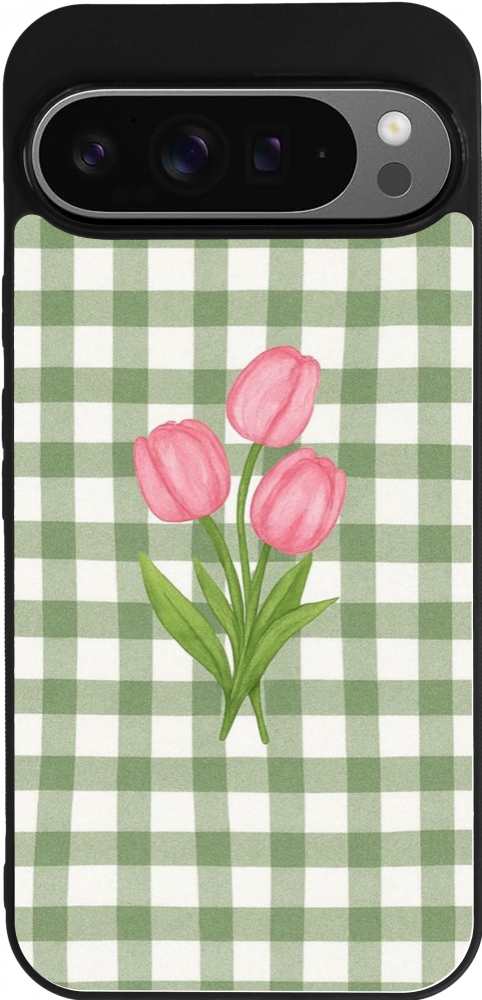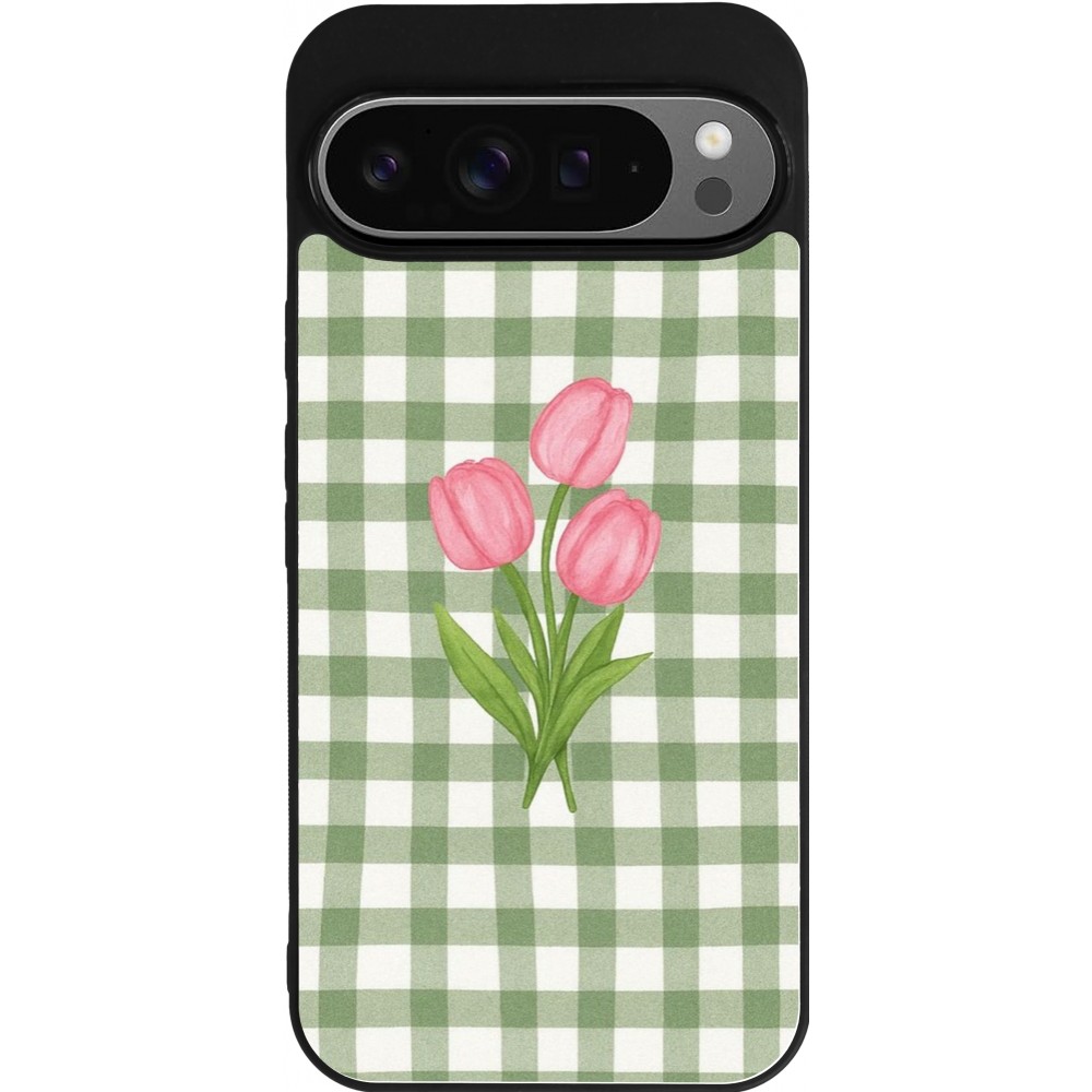 Coque Google Pixel 9 Pro XL - Silicone rigide noir Green vichy tulips Spring 2026