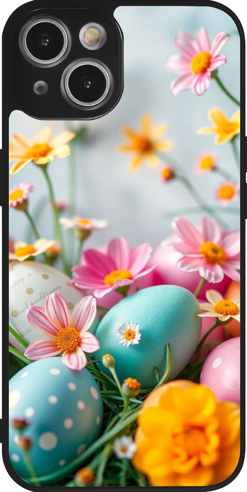 Coque iPhone 14 - Silicone rigide noir Easter 2026 Eggs with flowers