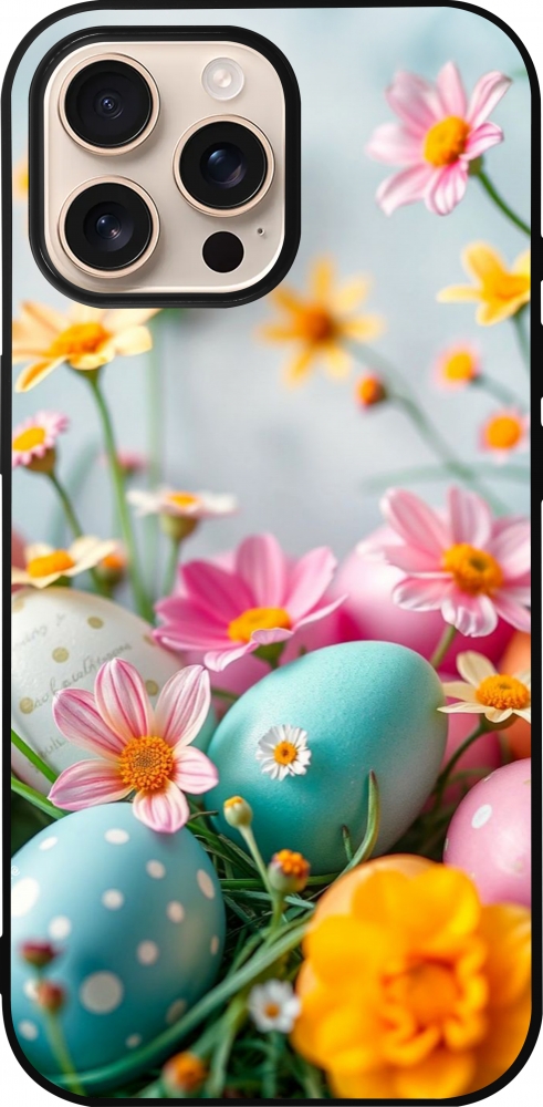 Coque iPhone 16 Pro Max - Silicone rigide noir Easter 2026 Eggs with flowers