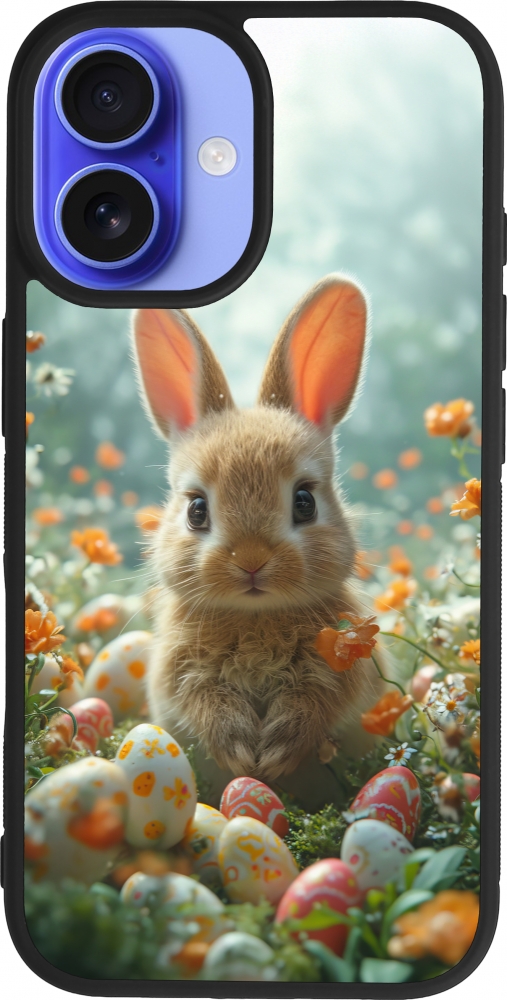 Coque iPhone 16 - Silicone rigide noir Easter 2026 Rabbit in the garden